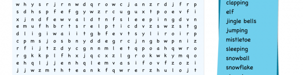 Can you find the words clapping, elf, jingle bells, jumping, mistletoe, sleeping, snowball, snowflake, stomping, and whispering? Word searches are a fun way to practice spelling, letter recognition, and reading skills. This puzzle has words hidden across, down, and diagonally.